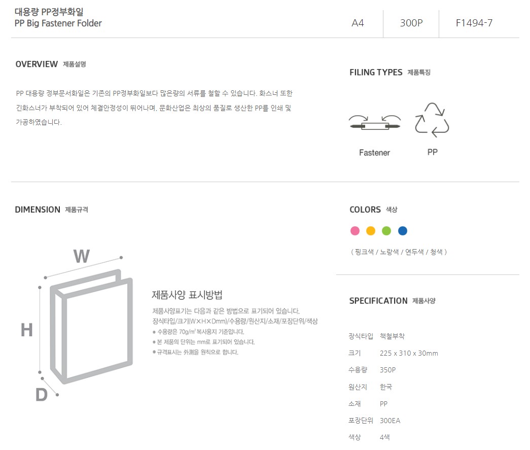 A4(225*310*T30mm), PP, BLUE, 350매, 10EA/PK, 책철부착, 대용량